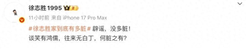 徐志胜首先在社交平台发文,用一句极具文化底蕴的古文回应:“谈笑有鸿儒,往来无白丁,何脏之有?” 这句话化用自唐代文学家刘禹锡的《陋室铭》,原句为 “谈笑有鸿儒,往来无白丁”,意为与自己交往的都是有学识、有修养的人。徐志胜巧妙化用,既点明自己家中常有志同道合的朋友相聚,氛围高雅,又间接反驳了 “环境脏乱” 的说法,语言简洁又充满智慧,展现了其毕业于名校的文化功底,也让网友纷纷点赞 “不愧是脱口秀演员,回应都这么有梗”。